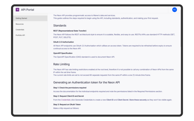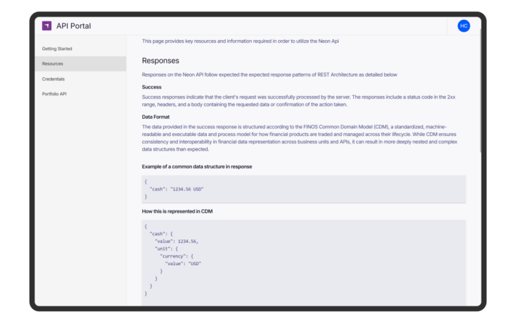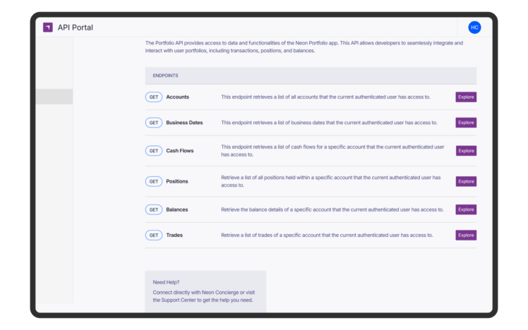 Seamlessly integrate Neon Portfolio account data into your workflows using the Neon API. Our RESTful API can be set up via our intuitive developer portal, which provides guidance to test, build, and deploy all available endpoints.